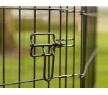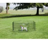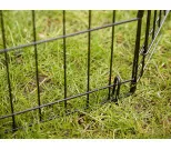 Suositellaan pienille pennuille ja pienille aikuisille koirille. Sopii ulko- sekä sisätiloihin. Helppo asentaa, ei tarvita työkaluja. Vie koottuna vähän tilaa. 8 toisiinsa kiinnitettävää paneelia, yhden paneelin koko 61 x 61 cm.