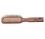Tumma puuharja, puupiikit. Joustavapohjainen, valkoinen. Varsi aitoa lakattua puuta. Kapea, 5 riviä piikkejä.