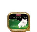 Animonda vom Feinsten Adult on tasapainoinen märkäruoka täysikasvuisille kissoille. Tarkoin valitut lihaisat raaka-aineet takaavat makunautinnon kissallesi. Se ei sisällä muita hiilihydraattilähteitä, mikä tekee siitä sopivan ruoka-aineyliherkille tai viljaintoleranssista kärsiville kissoille. Korkea lihapitoisuus varmistaa riittävän proteiinin saannin. Kissa tarvitsee erityisesti eläinvalkuaista lajinmukaiseen ruokavalioon ja pystyykin parhaiten hyödyntämään sitä. Luonnollinen tauriini edistää erityisesti näkökykyä ja sydämen terveyttä. Ruoka on valmistettu ilman soijaa, viljaa ja geenimuunneltuja aineksia sekä keinotekoisia väriaineita, säilöntäaineita ja makuaineita.Tämä gourmet-patee tarjoaa täysikasvuiselle kissallesi kaikki tarpeelliset ravintoaineet.