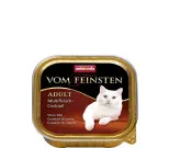 Animonda vom Feinsten Adult on tasapainoinen märkäruoka täysikasvuisille kissoille. Tarkoin valitut lihaisat raaka-aineet takaavat makunautinnon kissallesi. Se ei sisällä muita hiilihydraattilähteitä, mikä tekee siitä sopivan ruoka-aineyliherkille tai viljaintoleranssista kärsiville kissoille. Korkea lihapitoisuus varmistaa riittävän proteiinin saannin. Kissa tarvitsee erityisesti eläinvalkuaista lajinmukaiseen ruokavalioon ja pystyykin parhaiten hyödyntämään sitä. Luonnollinen tauriini edistää erityisesti näkökykyä ja sydämen terveyttä. Ruoka on valmistettu ilman soijaa, viljaa ja geenimuunneltuja aineksia sekä keinotekoisia väriaineita, säilöntäaineita ja makuaineita.Tämä gourmet-patee tarjoaa täysikasvuiselle kissallesi kaikki tarpeelliset ravintoaineet.