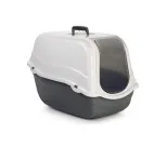 Perinteinen katettu kissavessa. Ylä- ja alaosa helppo kiinnittää toisiinsa. Alaosa on harmaa, yläosa valkoinen. Muovinen heiluriovi on irroitettava, jotta sen saa helposti pestyä.