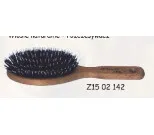 Puuharja, aitoa harjasta/nailonpiikeillä. Joustavapohjainen, musta (pohjan väri voi vaihdella). Varsi aitoa lakattua keskitummaa puuta.Harjas on tehty villisian karvasta. Keskikokoinen, ovaali, 10 riviä.