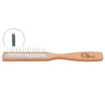 Perinteinen kapea puuvarsinen piikkiharja, metallipiikit joissa EI palloja piikkien päässä. Pehmeä. Joustavapohjainen, valkoinen pohja (pohjan väri voi vaihdella). Varsi aitoa lakattua puuta. 3 riviä piikkejä.