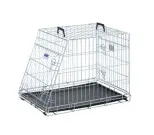 Sinkitty kokoontaitettava koiran metallihäkki. Automalli, yksi seinä on vino. Helppo koota ja kasata. Ovi molemmissa päädyissä. Kantokahvat. Sisällä muovinen alusta jossa matalat reunat. Liukueste pohjassa. Koko 61 x 91 x 71 cm.