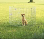 Suositellaan isoille pennuille ja isoille aikuisille koirille. Sopii ulko- sekä sisätiloihin. Helppo asentaa, ei tarvita työkaluja. Vie koottuna vähän tilaa. 8 toisiinsa kiinnitettävää paneelia, yhden paneelin koko 61 x 107 cm.