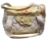 Todella kaunis kantokassi. Pohja keinonahkamainen. Ylhäällä tikattu beige kangas ja Angel kuvio. Sisältä pehmeää karvaa, Alhaalla ilmanvaihdon takaamiseksi pienet vahvistetut kolot. Sivutasku ja kiinnitysremmi.