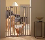 Erittäin vahva portti aikuisille koirille. Säädettävissä oviväliin 75 - 84 cm. Portin korkeus 107 cm. Pinnaväli 5,3 cm. koko 74 x 4,5 x 107 cm. Portissa on pikkuovi, josta pienet eläimet voivat kulkea. Pikkuoven koko on 17 x 28 cm ja siinä on oma lukitus-/avausmekanismi. Helppo asentaa, poraamista ei tarvita. Portti avattavissa molempiin suuntiin.