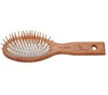 Piikkiharja, muovipiikeillä. Joustavapohjainen, valkoinen. Varsi aitoa lakattua keskitummaa puuta. Muovipallot piikkien päässä.