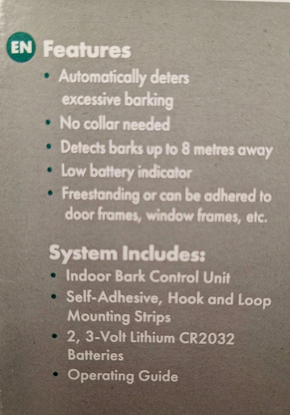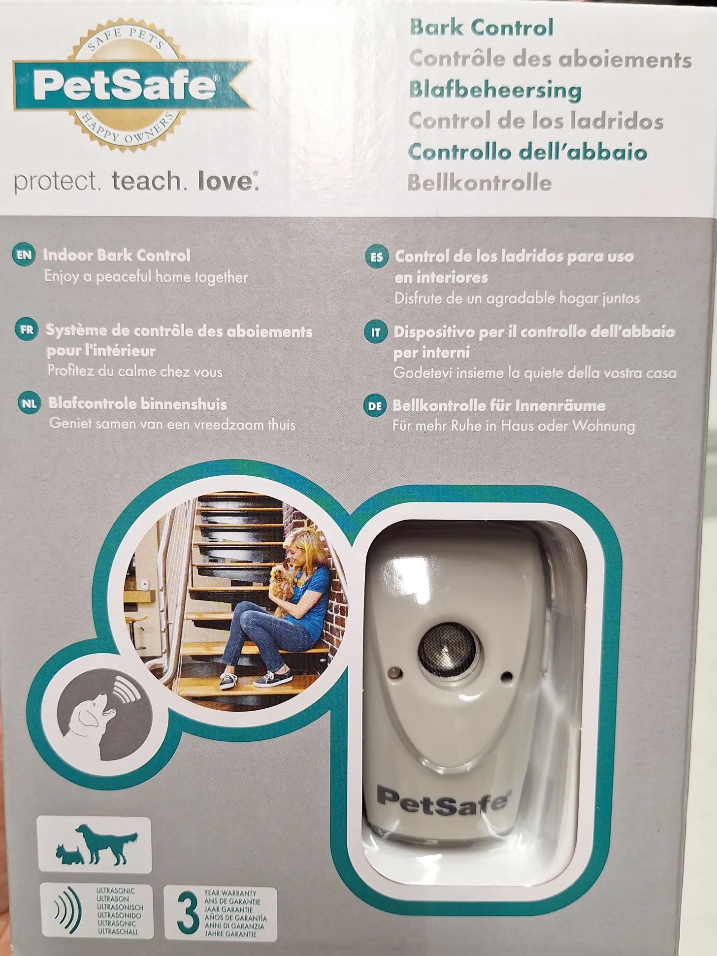 Laitteen päästämä ääni on turvallinen ja tehokas eikä se satuta koiraa eikä ihmistä. Laite toimii 3V-paristoilla ja soveltuu vain sisätilassa käytettäväksi.