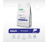 Nature's Protection Superior Care Veterinary Diet Dermatosis Lohi -täysravinto on erityisesti suunniteltu parantamaan ihon ja turkin terveyttä lemmikeillä, joilla on oireita tai jo käynnissä olevia sairauksia kuten atooppinen ihottuma tai allergiset reaktiot. Ruoka sisältää ainoastaan yhtä eläinproteiinin lähdettä, mikä auttaa välttämään muita eläinproteiiniallergeeneja, jotka voivat aiheuttaa oireita. Resepti ei sisällä viljaa eikä gluteenia, mikä vähentää viljaproteiiniallergian ja gluteeniyliherkkyyden riskejä. Pääasiallinen proteiinilähde on lohi, joka on hyödyllinen iho-ongelmista kärsiville koirille useista syistä. Lohi sisältää runsaasti Omega-3 -rasvahappoja, jotka ovat tärkeitä ihon ja turkin terveydelle. Ne auttavat ylläpitämään terveitä solukalvoja mikä parantaa ihon kimmoisuutta ja palauttaa ihon vaurioituneen suojakerroksen. Ne auttavat myös pitämään karvatupet terveinä, mikä edistää tervettä karvojen kasvua. Omega-3-rasvahapot (erityisesti EPA ja DHA) vähentävät myös ihon tulehdusta ja siihen liittyvää kutinaa, sillä niillä on tulehdusta ehkäiseviä ominaisuuksia. Ravinto sisältää juuri oikean määrän huolellisesti valittuja aminohappoja, joiden ansiosta kyynelten ja syljen koostumus pysyy kirkkaana. Tämä auttaa estämään punertavien värjäymien muodostumista turkkiin.