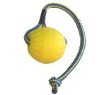 Kestävän köyden päässä Durafoamista valmistettu pallo. Pallon päällä ei ole kangasta, kuten esim. tennispalloissa, joten se on turvallisempi vaihtoehto. Silti pehmeä ja turvallinen hampaille ja ikenille. Pallo kelluu, joten se on erinomainen vesilelu. Köyden ansiosta se lentää tarvittaessa kauas.