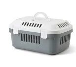 Muovinen kuljetusboksi pieneläimille, max. 5 kg. Kantokahva, päältä avautuva kansi. Koko 33 x 48,5 x 23,5 cm, alaosan väri harmaa, yläosa valkoinen.