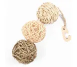 Kolme erilaista ripustettavaa palloa pienen lemmikkisi iloksi. Pallot on sidottu toisiinsa narulla.